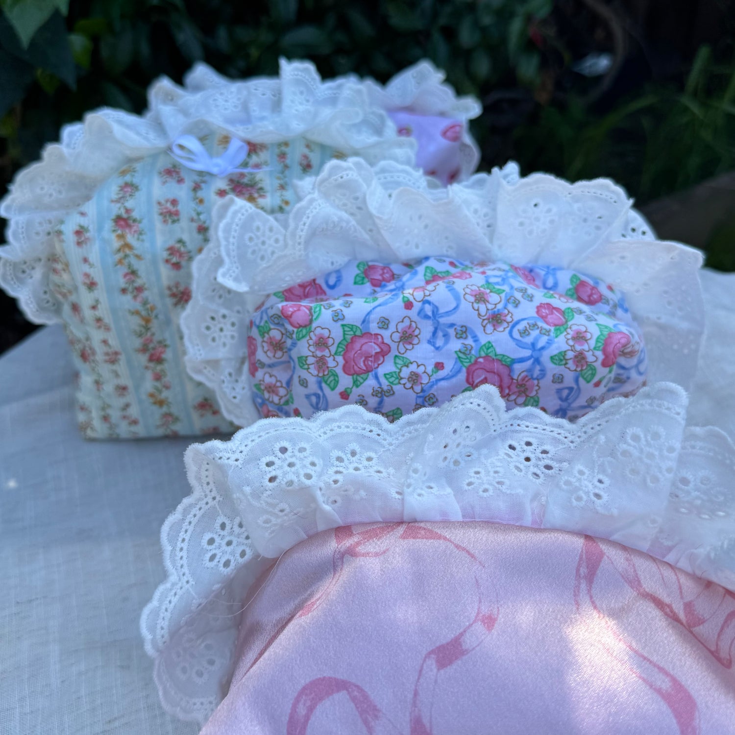 Every piece is handmade by me using secondhand fabrics, lace, and trims whenever possible. My goal is to keep the process as sustainable and low-waste as I can while turning forgotten textiles into something beautiful again.