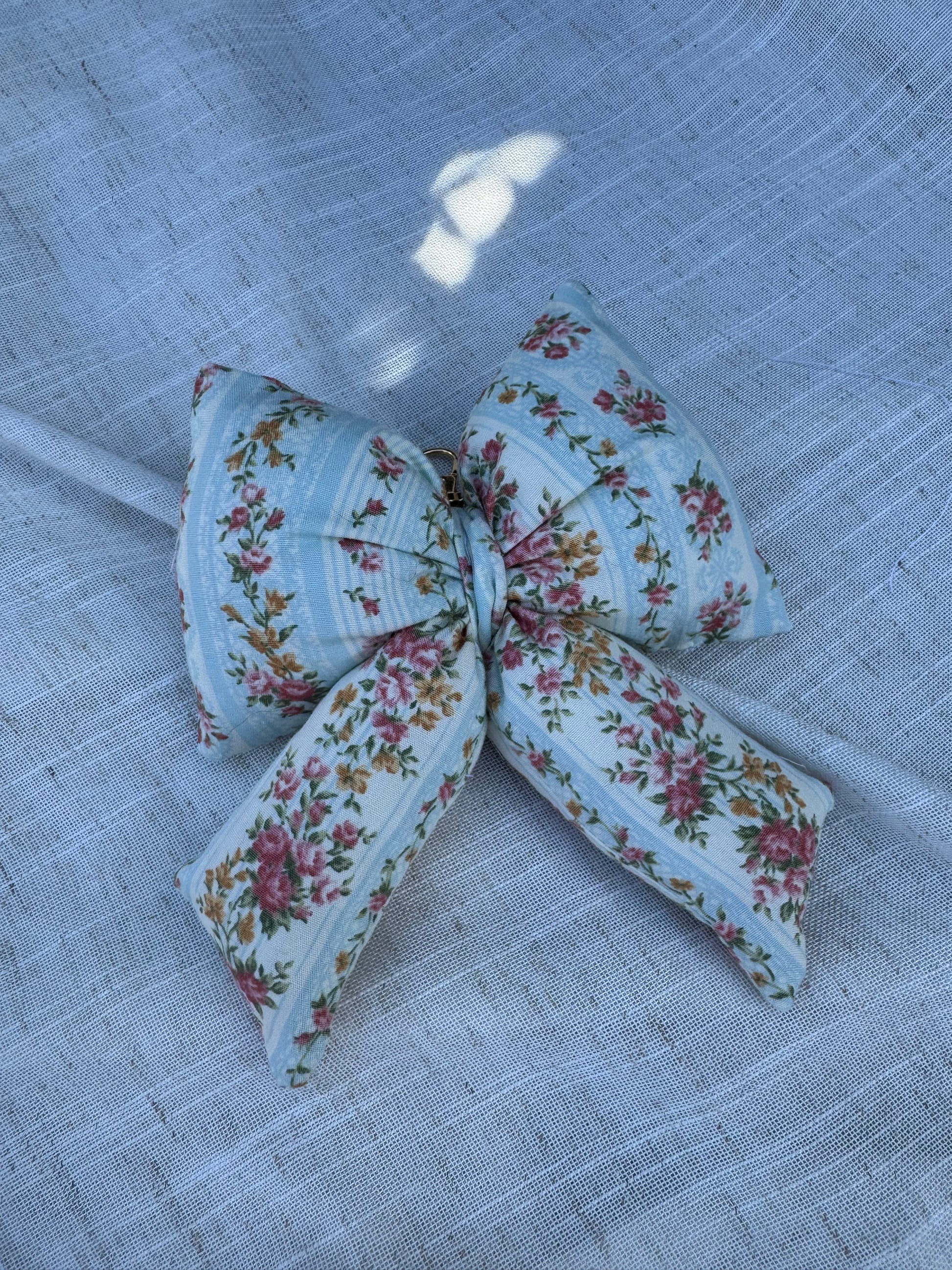 Add a little charm to your everyday bag. This handmade bow bag charm features a delicate vintage-inspired floral print on soft blue stripes, creating the sweetest heirloom feel. Lightly padded for a plush look and finished with a gold clasp, it’s the perfect feminine accent for totes, purses, backpacks, or keys.